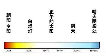 低色温光源的特征是能量分布中,红辐射相对来说要多些,通常称为“暖光”;色温提高后,能量分布中,蓝辐射的比例增加,通常称为“冷光”。一些常用光源的色温为:标准烛光为1930K(开尔文温度单位);钨丝灯为2760-2900K;荧光灯为6400K;闪光灯为3800K;中午阳光为5000K;电子闪光灯为6000K;蓝天为10000K。